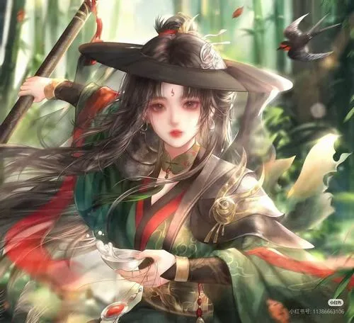 Hình đại diện ngầu cô nàng áo xanh, ánh sáng mềm, cầm kiếm, nền lá cây mờ lãng đãng