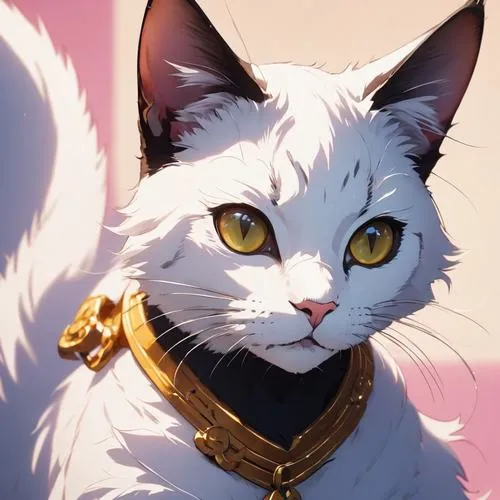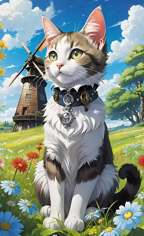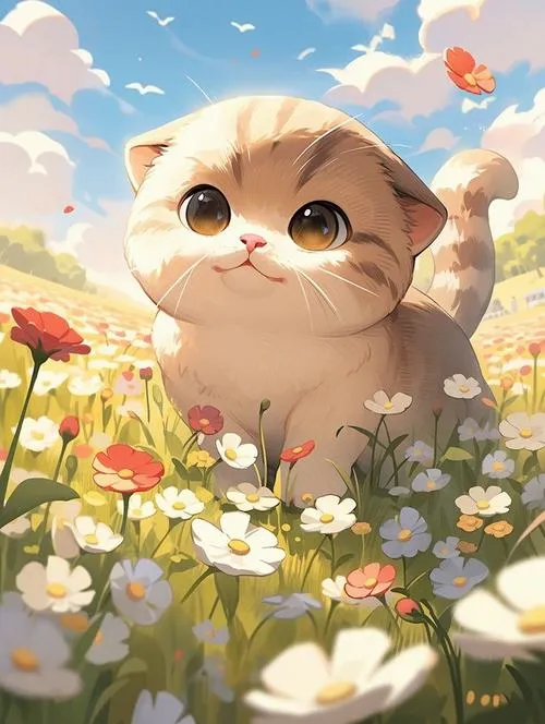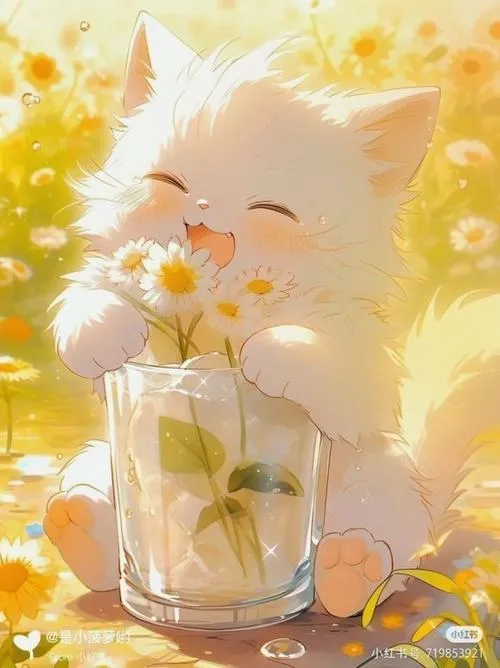 Ảnh mèo trắng giữa đồng hoa vàng, ánh nắng lấp lánh, phong cách anime chibi chữa lành.