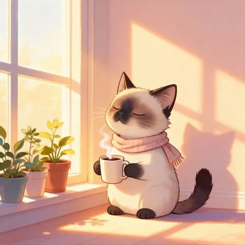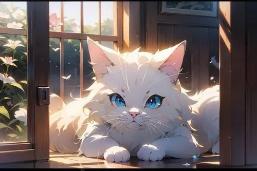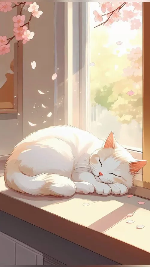 Ảnh mèo trắng ngủ trên bệ cửa sổ nắng vàng, vibe yên bình kiểu anime chibi.