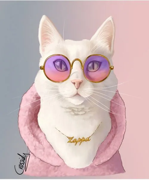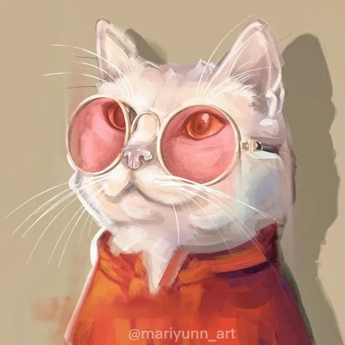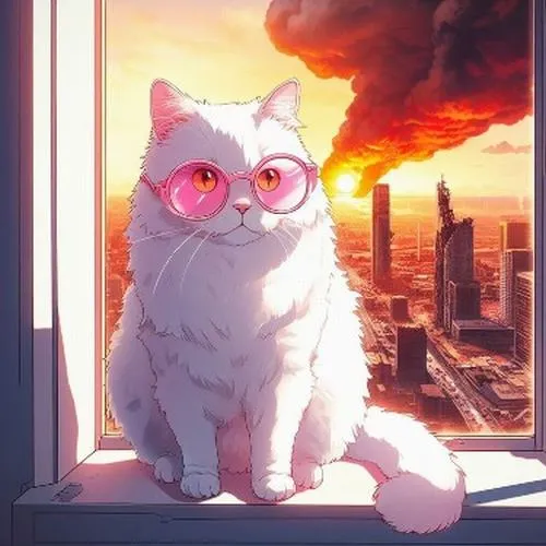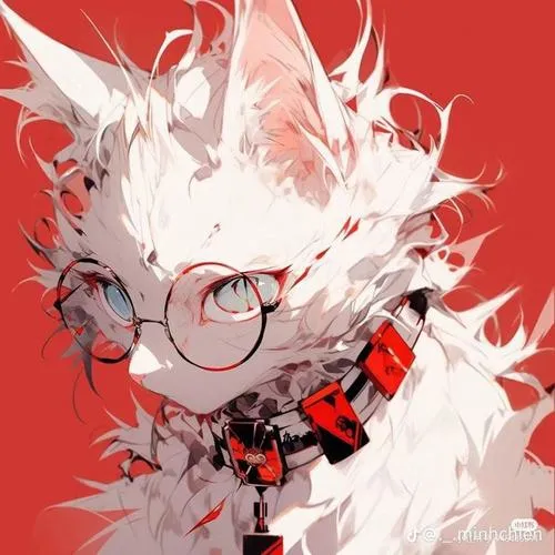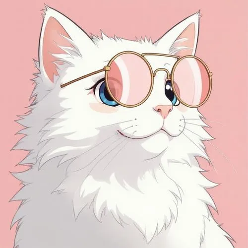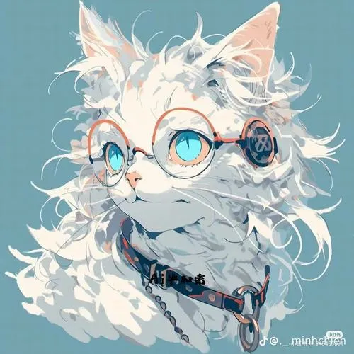 Ảnh mèo trắng anime nền xanh, kính tròn đáng yêu, đường nét sạch, hợp màn khóa gọn gàng.