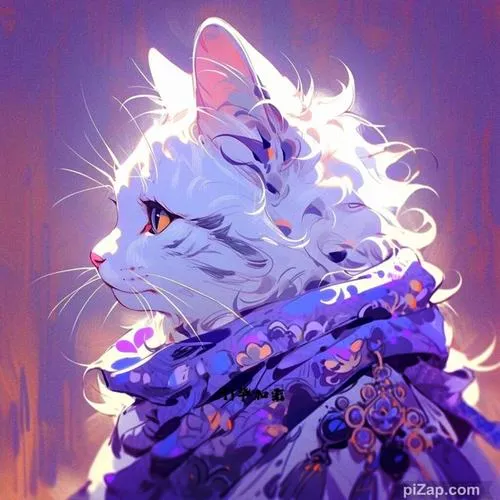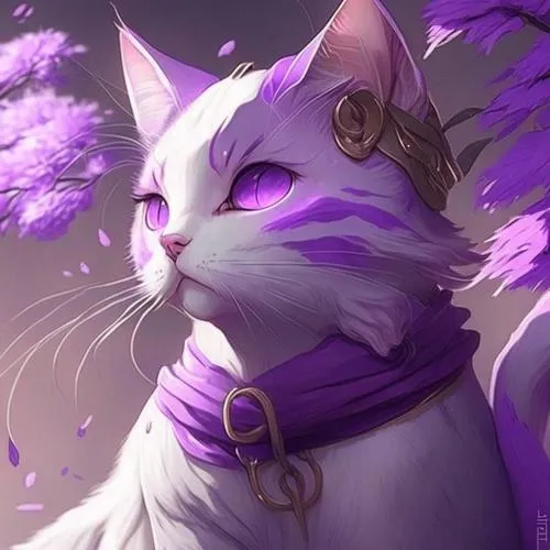 Bức mèo chibi choàng khăn tím phát sáng, hiệu ứng điện nhẹ, hợp hình nền ngầu mà đáng yêu.
