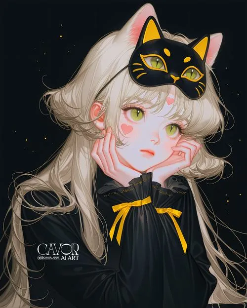 Ảnh cô gái anime đội phụ kiện mèo, tông tối huyền, làm hình nền chibi vừa lạ vừa cuốn.