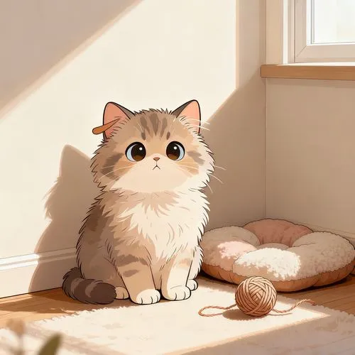 Hình mèo anime nằm trên ghế cạnh cửa sổ, nắng ấm trong phòng, nền thư giãn dịu mắt.