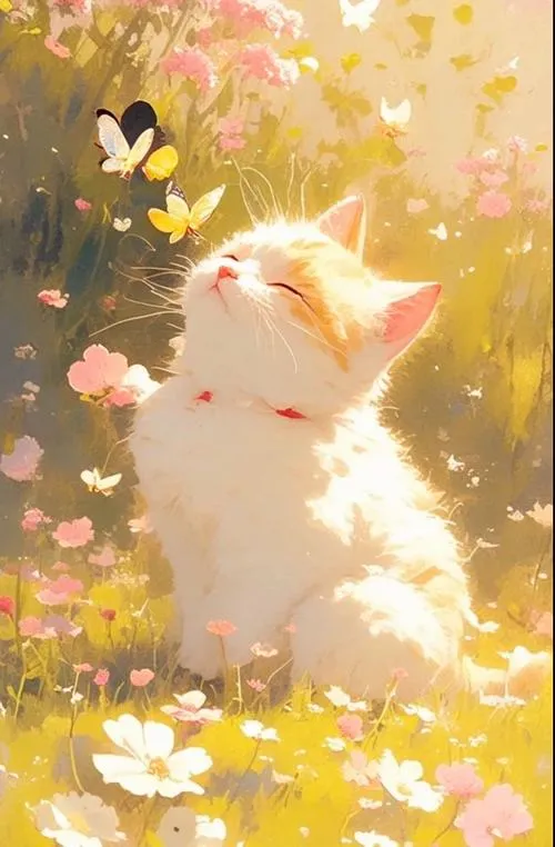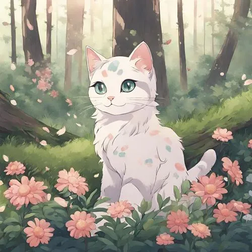 Hình mèo trắng anime ngồi giữa rừng hoa, ánh nắng rải nhẹ, vibe chữa lành rất hợp nền.