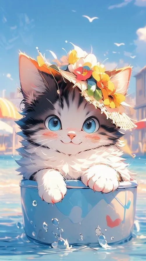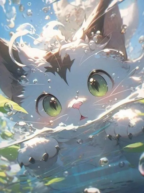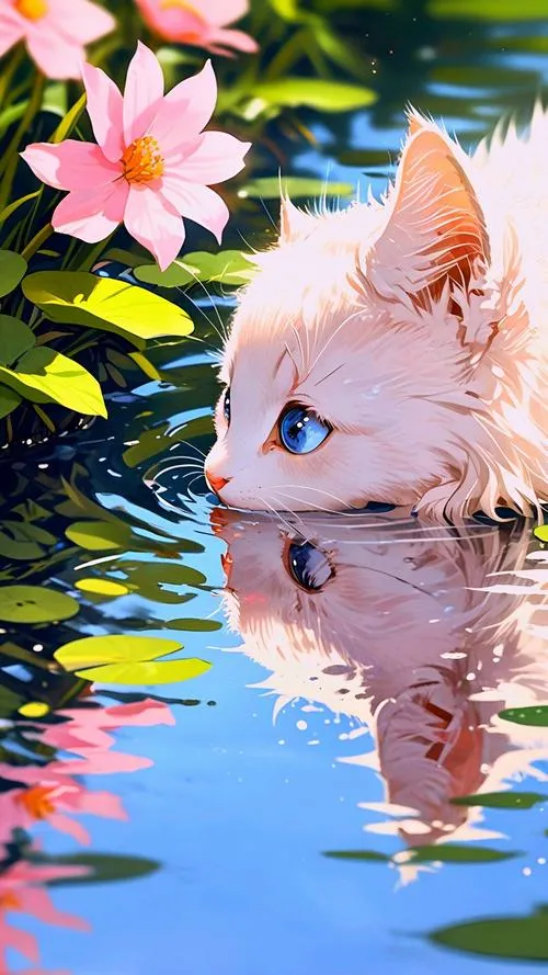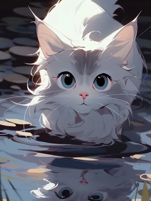 Bức mèo chibi thò đầu khỏi mép nước, ánh phản quang nhẹ, vibe tinh nghịch cho hình nền.