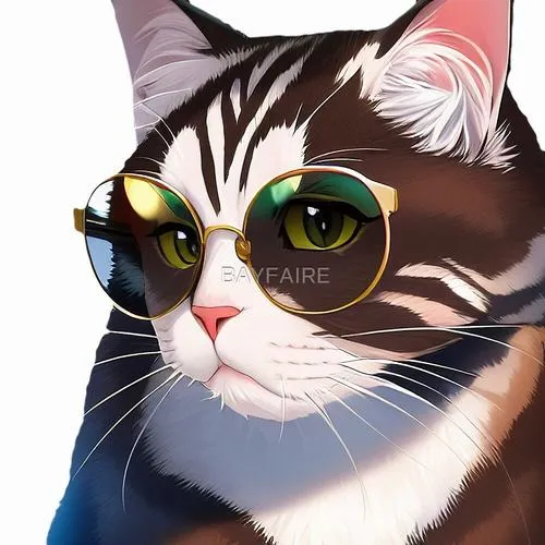 Hình mèo anime chibi đeo kính tròn, nền chấm màu vui mắt, hợp làm hình nền cá tính.