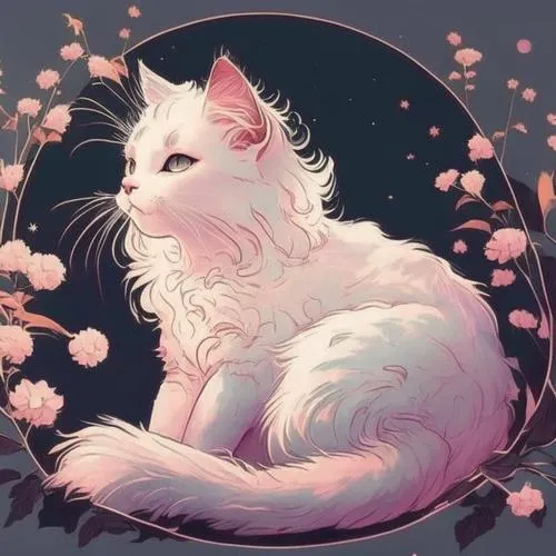 Khung mèo trắng anime cuộn tròn trong vòng hoa, nền đen hồng, cảm giác mơ màng dễ chịu.