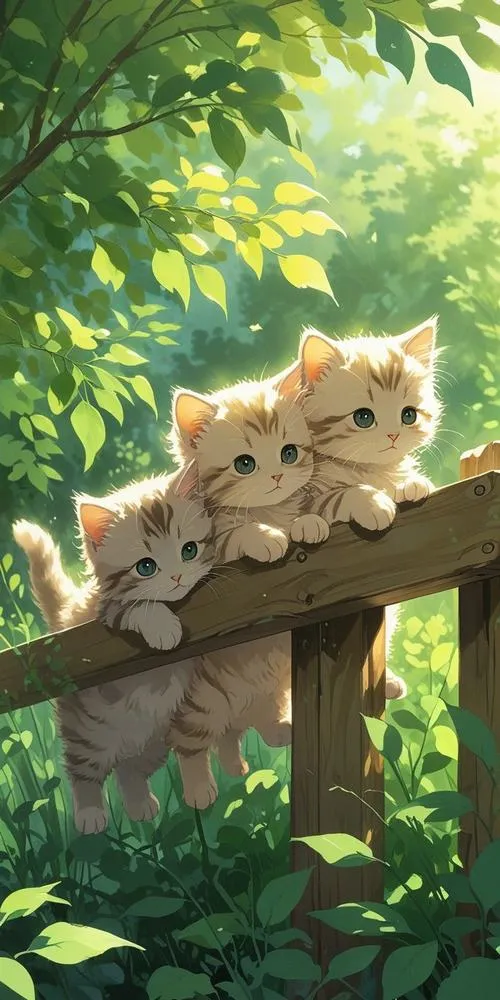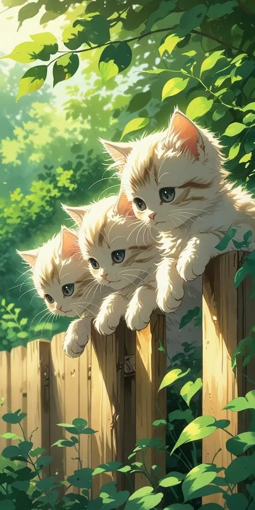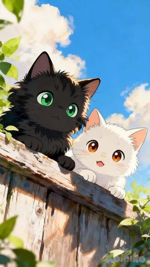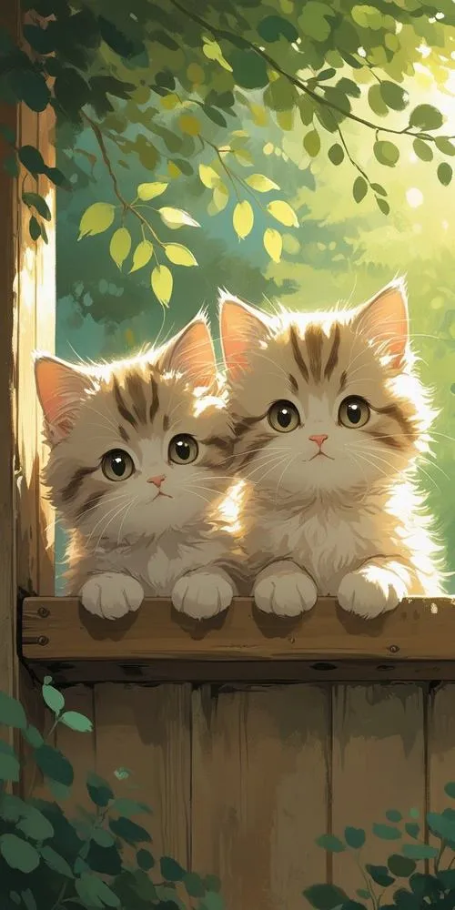 Bộ đôi mèo con ngồi sau hàng rào gỗ, nền cây xanh, cảm giác thân thuộc kiểu anime.