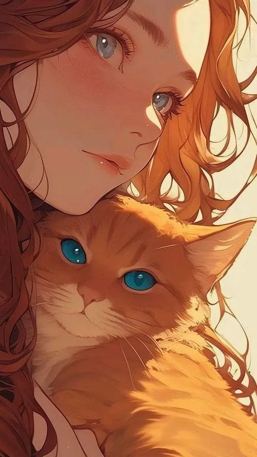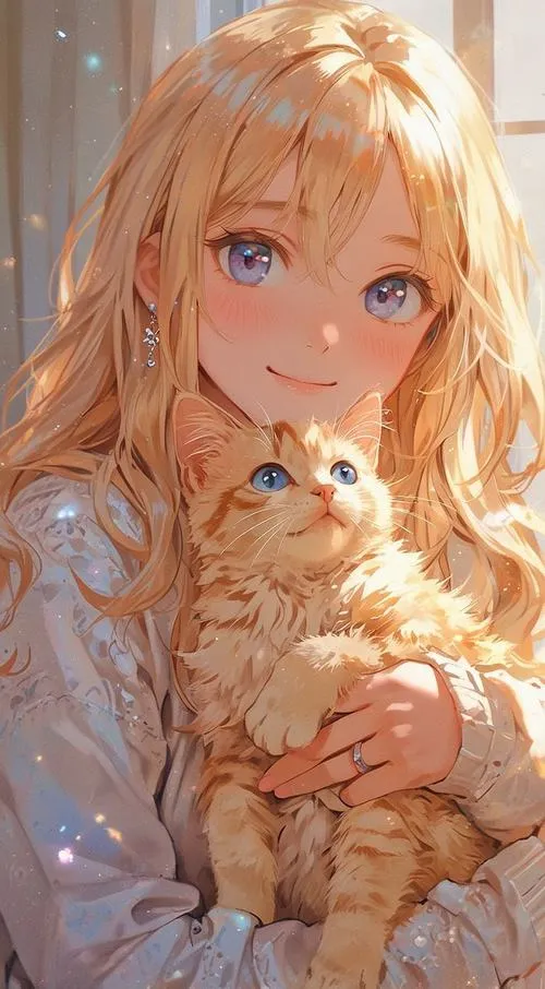 Cảnh cô gái tóc vàng bế mèo, tông ấm dịu, hợp hình nền mèo anime chibi