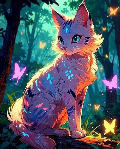 Hình nền mèo nhiều màu trong rừng đêm, hiệu ứng phát sáng, cảm giác huyền ảo cực cuốn.