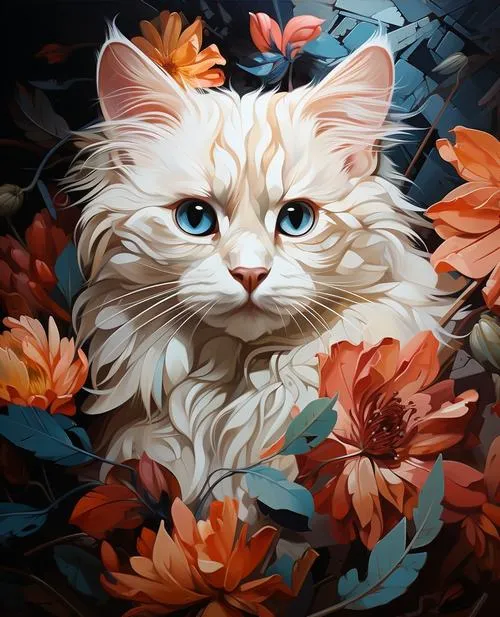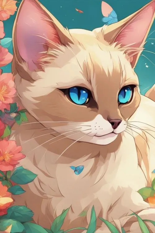 Ảnh mèo kem mắt xanh nổi bật giữa hoa lá, cảm giác sang mà vẫn đáng yêu.