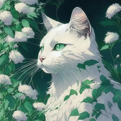 Hình nền mèo trắng nhìn nghiêng giữa lá xanh, nét mịn, hợp nền thanh mát và tinh tế.