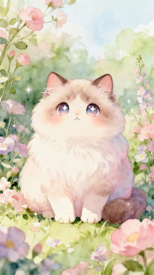 Hình nền mèo bông trắng giữa vườn hoa hồng, má hồng nhẹ, hợp nền pastel ngọt.