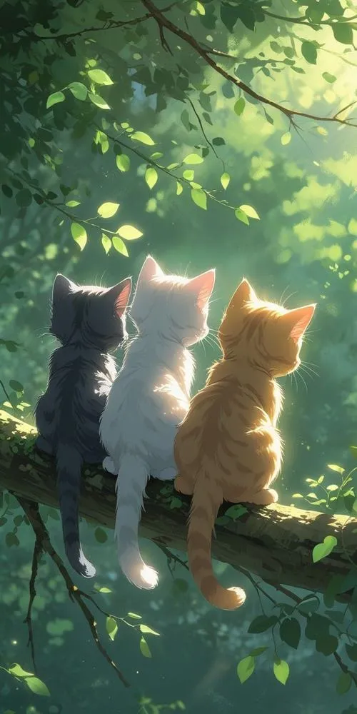 Góc ba con mèo chibi dạo trong rừng xanh, nắng xuyên lá, vibe bình yên dễ chịu.