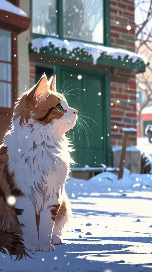 Ảnh mèo đi trong phố tuyết, ánh đèn lạnh, cảm giác mùa đông ấm áp kiểu anime.