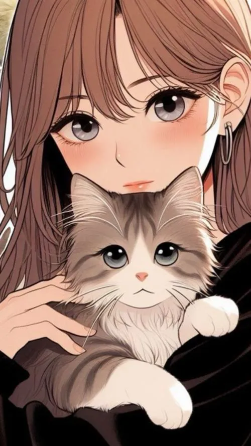 Ảnh cô gái anime bế mèo, tông nhẹ và ấm, hợp nền dọc kiểu chibi đáng yêu.