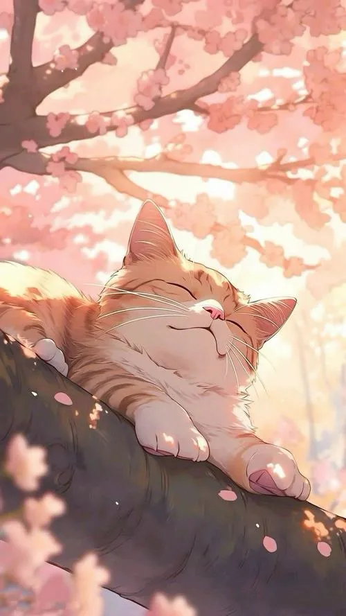 Khung mèo con anime ngủ say dưới nắng, màu kem dịu, làm hình nền nhẹ nhàng mỗi ngày.