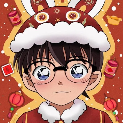 Conan chibi đội mũ Noel, kính tròn long lanh, nền đỏ họa tiết bánh kẹo vui mắt