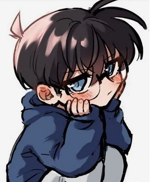 Conan chibi trùm áo hoodie, tay che mặt ngại ngùng, mắt kính lóe sáng, sắc lạnh đáng yêu