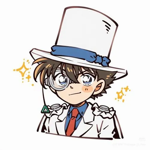 Conan chibi hóa Kaito Kid, đội mũ cao và áo choàng, nơ đỏ vẫn nổi bật đáng yêu