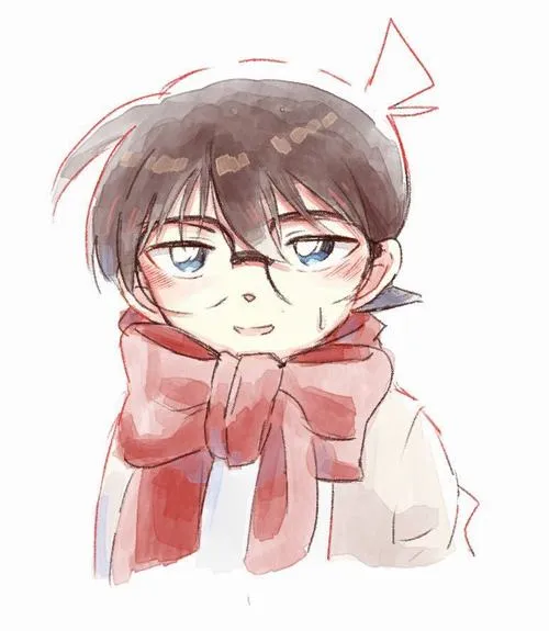 Conan chibi quàng khăn đỏ dày, mặt hơi bối rối, nét loang nhẹ như tranh nước dịu mắt