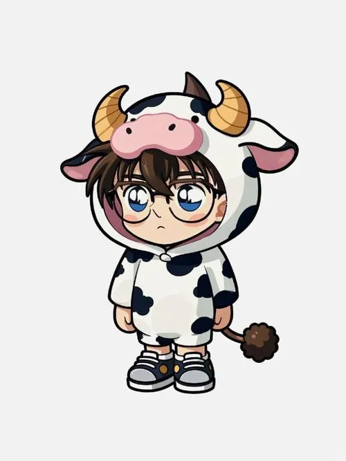 Conan chibi mặc đồ bò sữa, tai sừng nhỏ, dáng đứng tròn trịa, hợp làm nhãn dán dễ thương