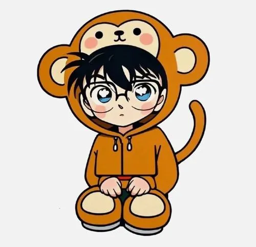 Conan chibi hóa khỉ mặc áo liền thân, cười tươi, tay chân mũm mĩm, vibe vui nhộn trẻ con