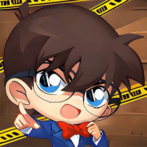 Hình Conan dễ thương cận mặt, tóc nhọn bo tròn, nền băng cảnh báo kiểu phá án vui nhộn