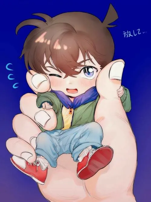 Conan chibi ngủ trong lòng bàn tay, mắt nhắm yên, má hồng nhẹ, cảm giác được nâng niu