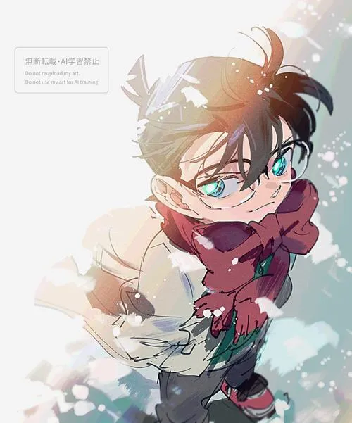Tranh Conan phong cách chibi phối màu watercolor, quàng khăn đỏ, không khí mờ ảo nhẹ nhàng