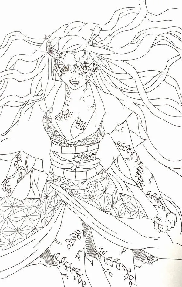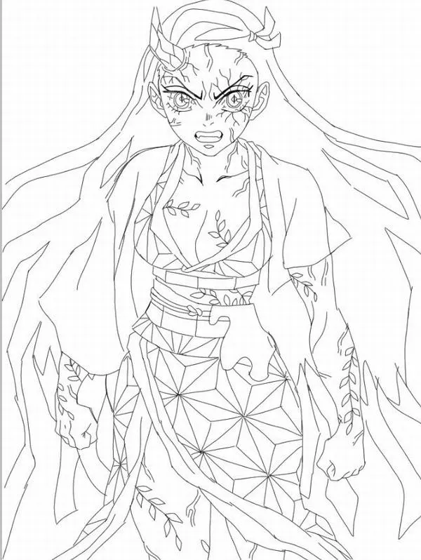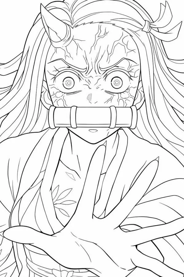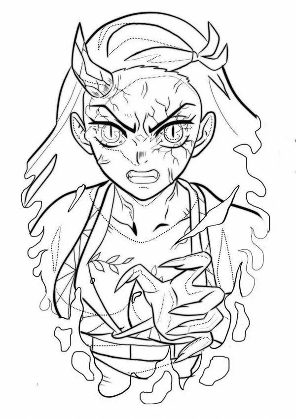Hình vẽ tranh tô màu Nezuko Kamado dạng quỷ, vết vằn rõ, móng tay sắc, khói mờ bao quanh