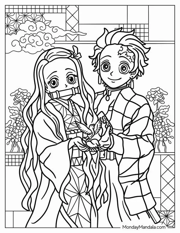 Trang tô màu Nezuko và Tanjiro, Tanjiro cõng hộp gỗ, Nezuko ló mặt với ống tre dễ thương