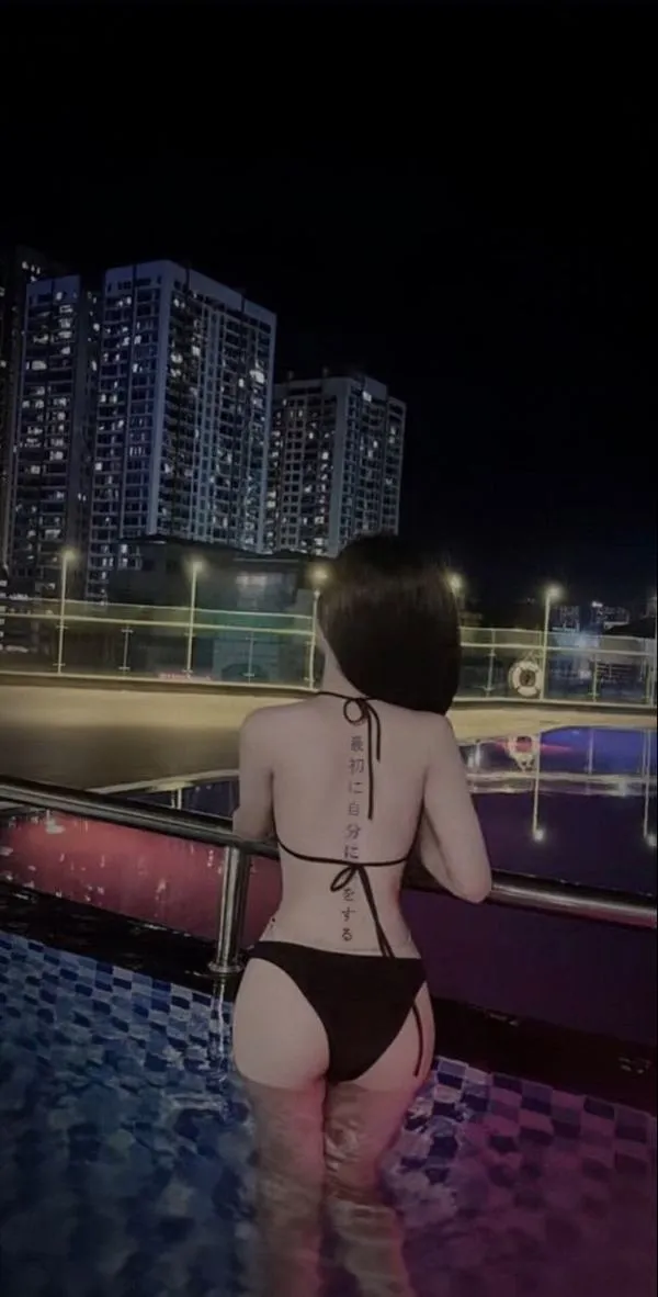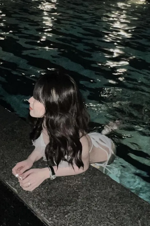 Nàng ngồi bên mặt nước, quay lưng, tóc rũ dài, bikini ôm dáng, vai trần mịn, vibe yên mà nóng.