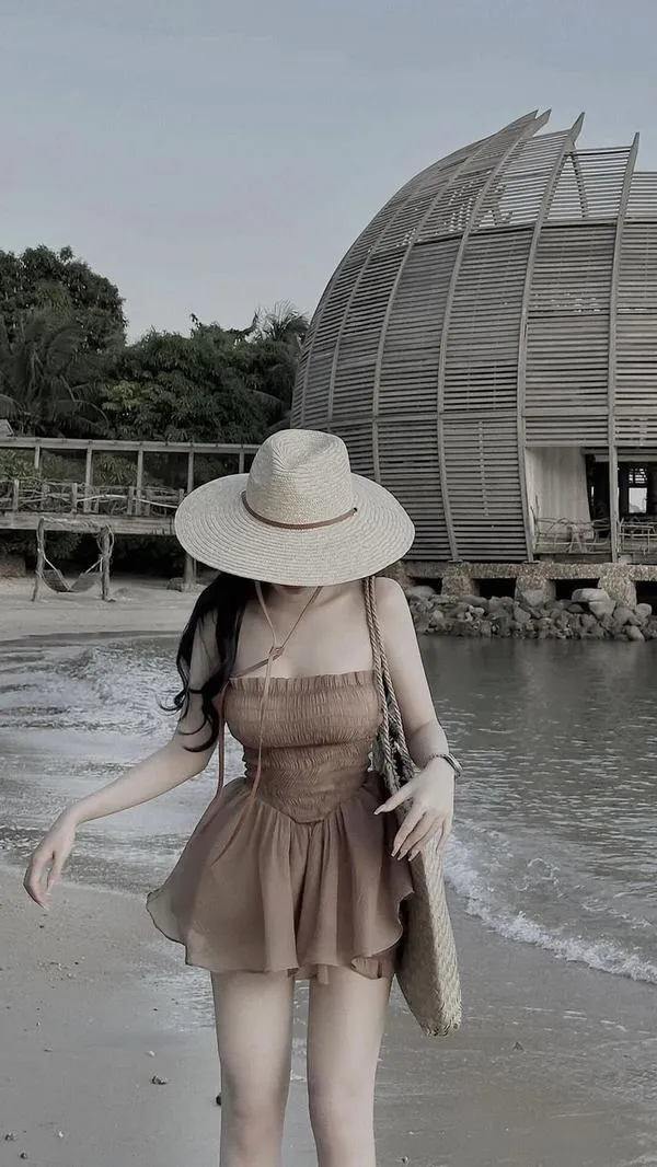 Đôi khi quyến rũ không phải kiểu nhìn thẳng, mà là kiểu ngại ngùng quay đi một chút. Nàng kéo mũ xuống, dùng tay che mặt, tóc dài rơi qua vai, bikini ôm dáng vừa khít. Gái mặc bikini che mặt có cái đáng yêu rất lạ, như đang trêu người xem mà vẫn giữ khoảng cách. Nhìn thấy eo thon, đôi chân dài và làn da bắt nắng, tự nhiên thấy mùa hè cũng biết cách làm người ta bối rối.