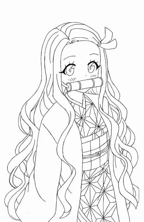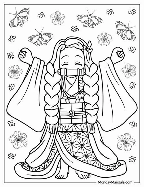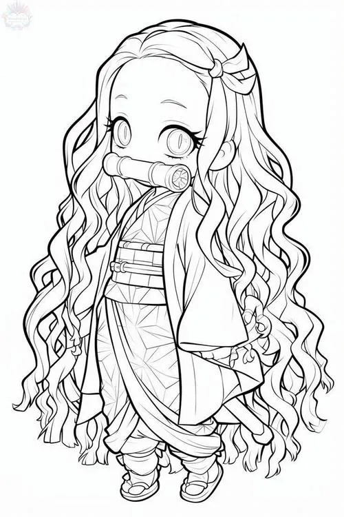 Tờ giấy tô màu Nezuko với ống tre, kimono nhiều họa tiết, mắt to tròn dễ phối màu