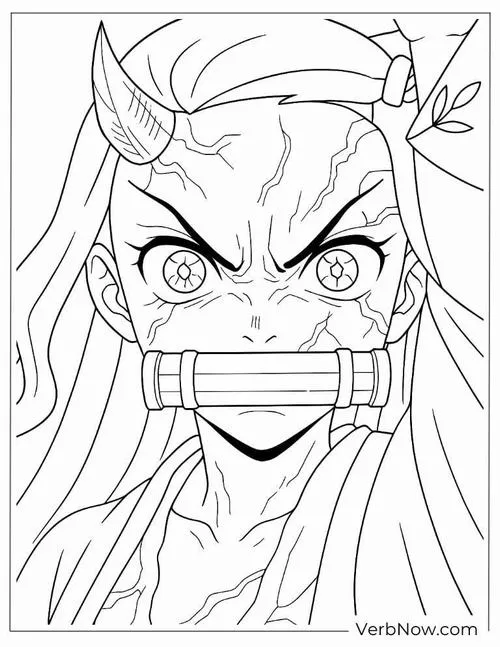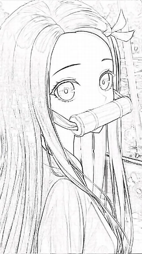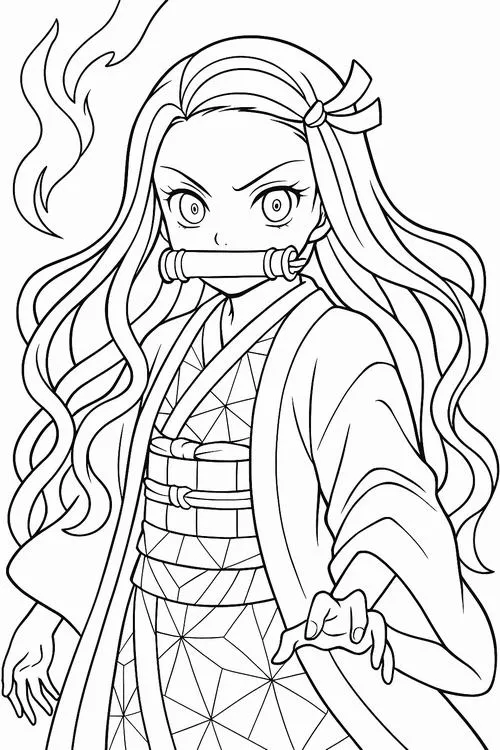 Tô màu sáng tạo Nezuko biểu cảm quyết liệt, ống tre nổi bật, tóc bay mạnh tạo điểm nhấn