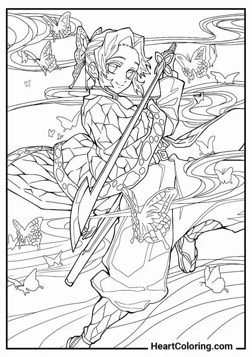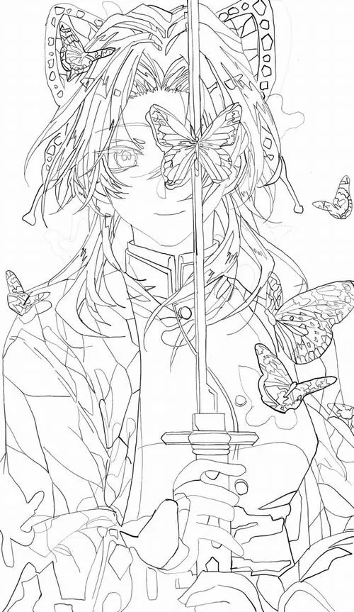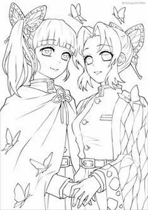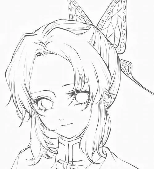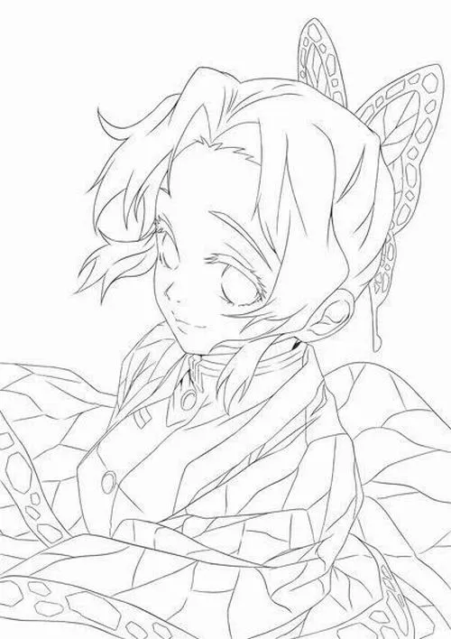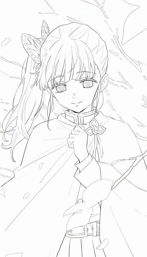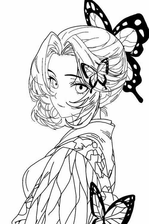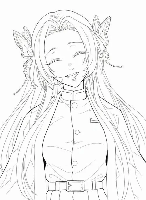 Trang tô màu Shinobu tóc kẹp cánh bướm, ánh mắt dịu, cổ áo đồng phục Diệt Quỷ rõ nét