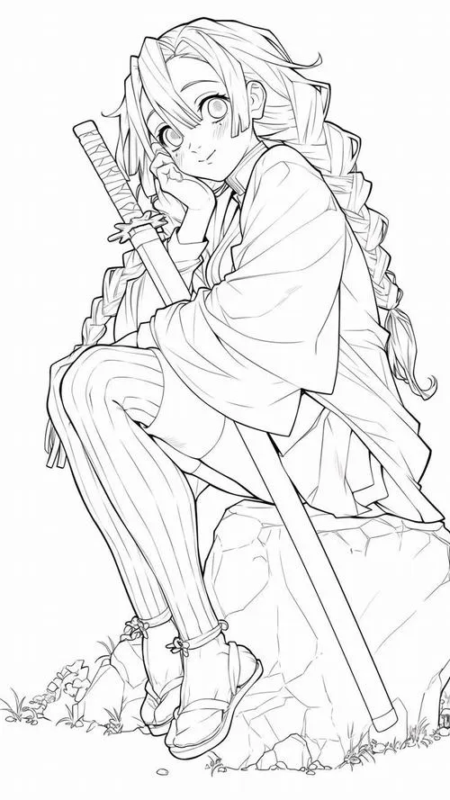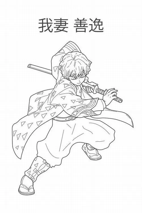 Hình vẽ tranh tô màu chibi kiếm sĩ chỉ tay, áo haori họa tiết rõ, hợp bé tập tô mảng lớn