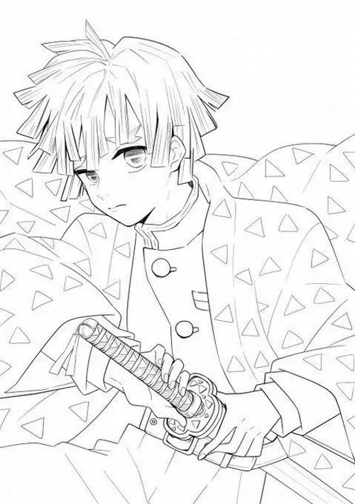Kiếm sĩ trẻ cầm kiếm trước ngực, haori họa tiết tam giác, nét viền gọn dễ lên màu