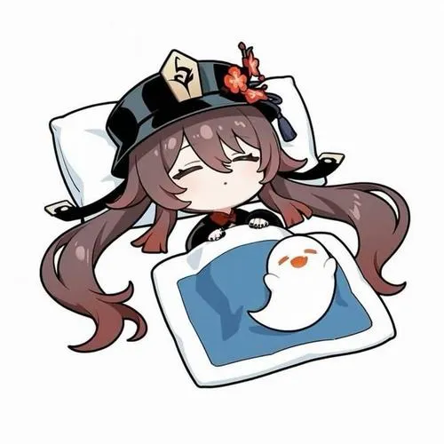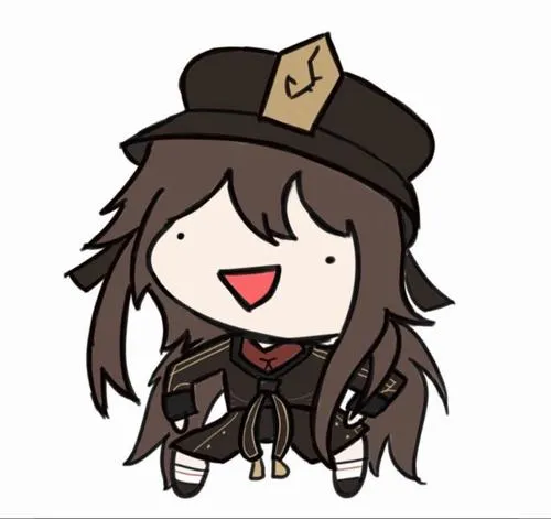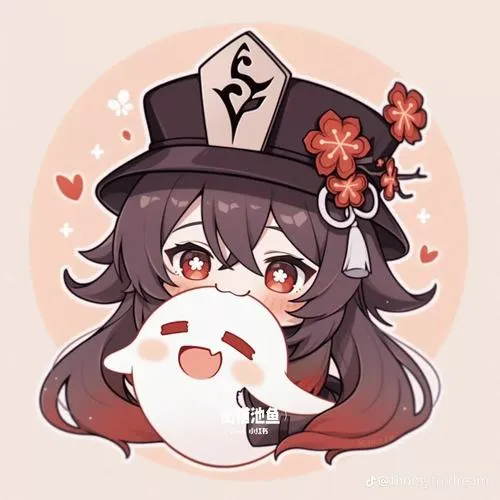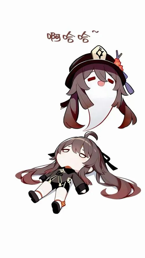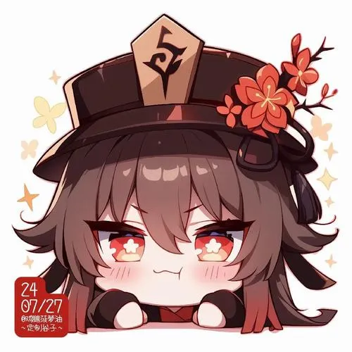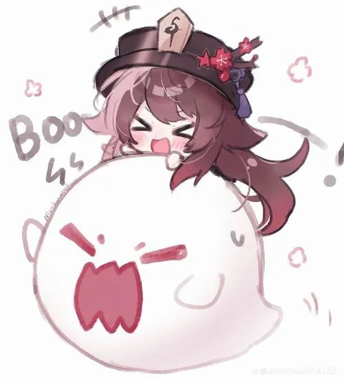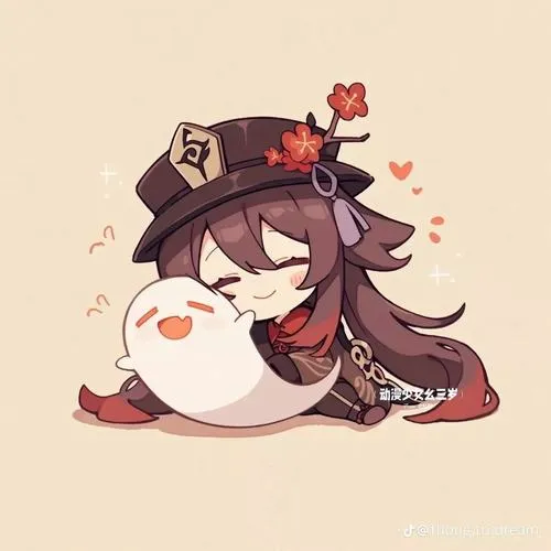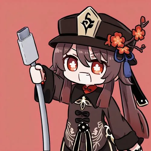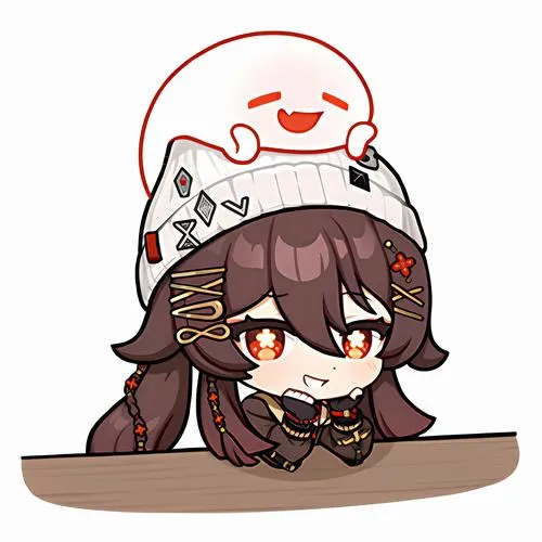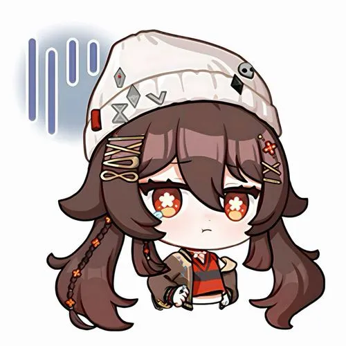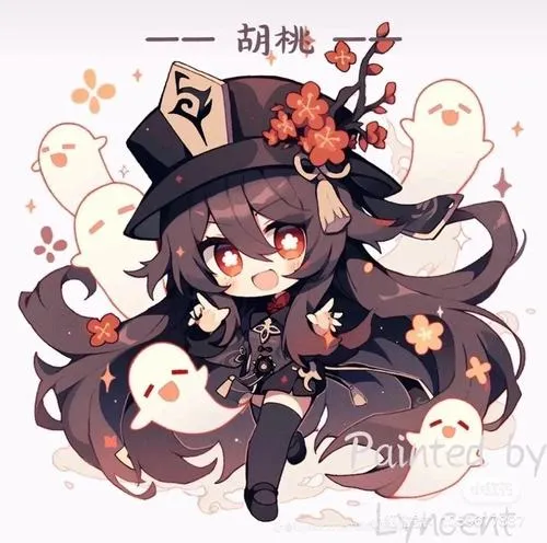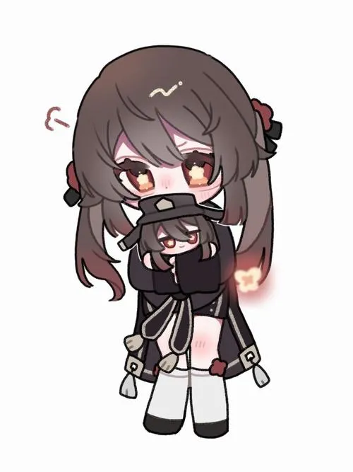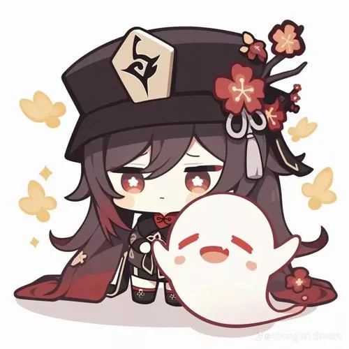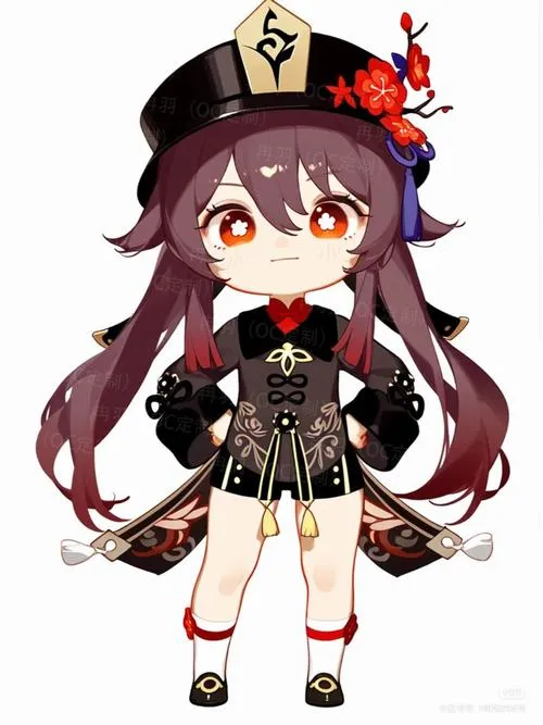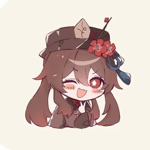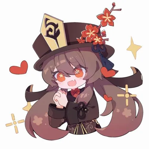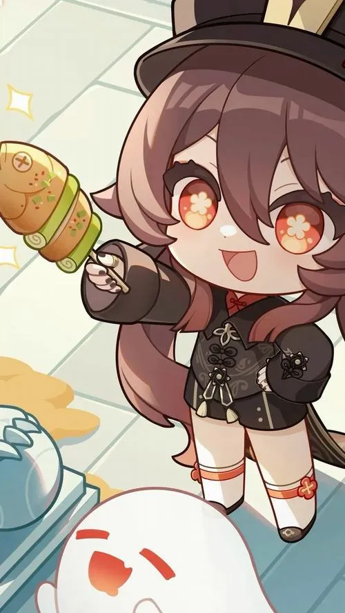 Fanart game Hu Tao chibi, viền nét rõ, tia nhỏ lấp lánh, phù hợp làm hình nền