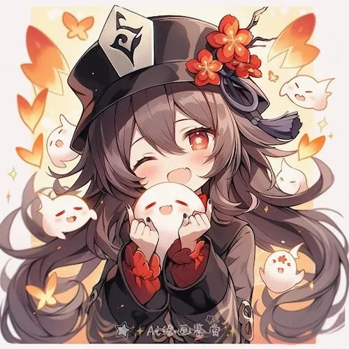 Hu Tao chibi bí ẩn mà cute, mắt tròn long lanh, tàn sáng bay quanh phụ kiện bùa
