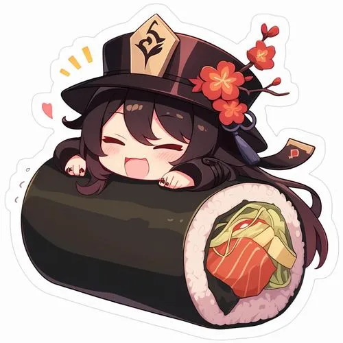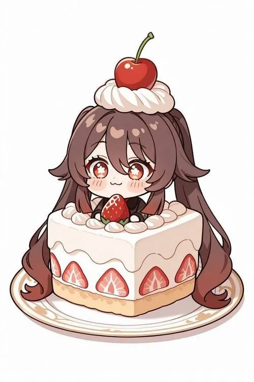 Minh họa Hu Tao chibi phong cách anime, đôi mắt long lanh, tóc lọn mềm, bố cục gọn