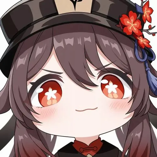 Hình Hu Tao chibi bí ẩn, mắt long lanh sắc sảo, bố cục gọn, điểm nhấn phụ kiện mũ