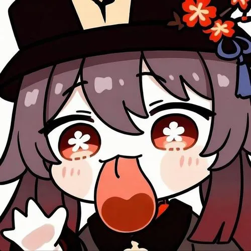 Hình Hu Tao phiên bản chibi, viền nét dày, má ửng hồng, hiệu ứng lửa nhỏ xinh