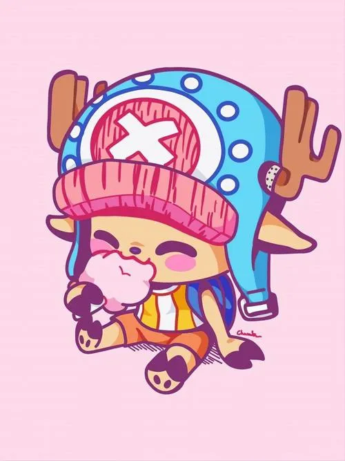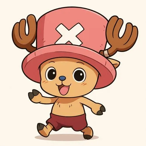 Tranh One Piece chibi Chopper tung tăng, mắt to má hồng, nền giấy cổ điển, nhìn rất dễ thương