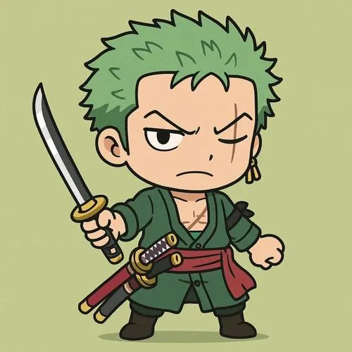 Hình Zoro chibi cười tươi ôm ba kiếm, nền trắng sạch, dùng làm avatar nhìn rõ nét