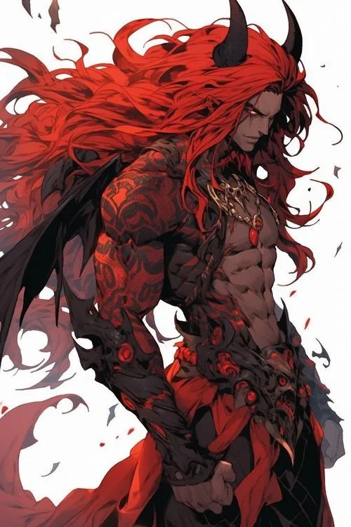 Ảnh fanart ác quỷ nam tóc đỏ bùng cháy, cơ bắp nổi, tà khí cuộn quanh cực ngầu
