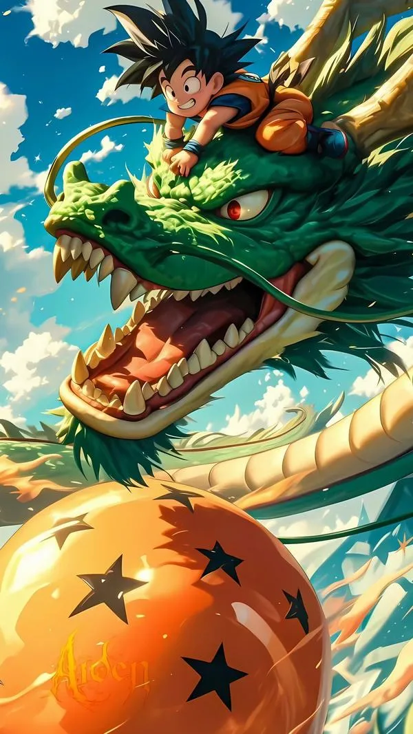 Ảnh nền Shenron ôm ngọc rồng, màu xanh vàng tương phản mạnh, nền mờ giúp rồng nổi khối rõ.