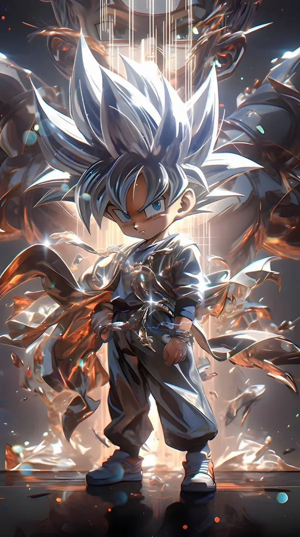 Ảnh nền Goku chibi siêu saiyan, tia điện xanh trắng, nền tối giúp nhân vật nổi bật rõ ràng.