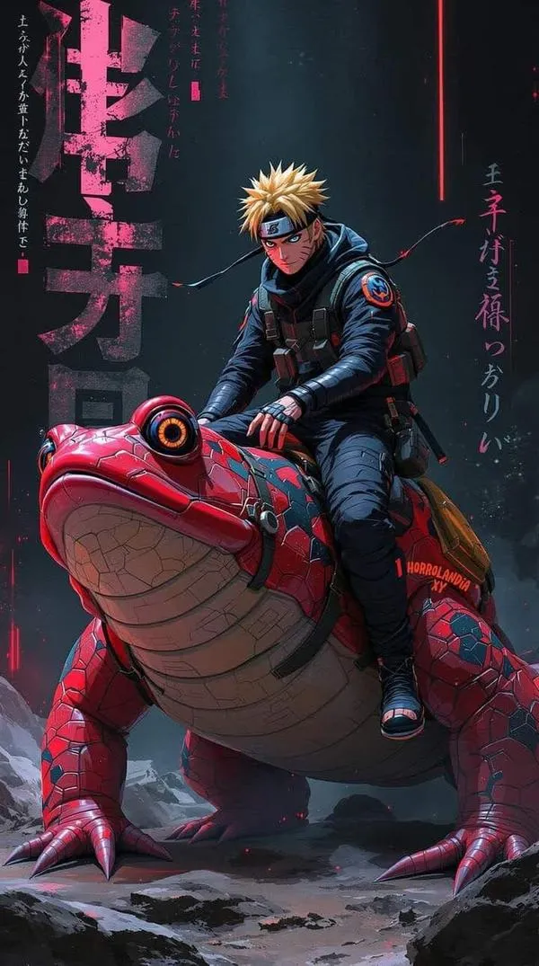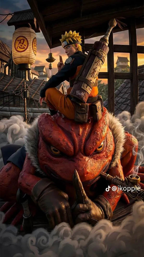 Hình nền Naruto 3D ngồi cùng sinh vật đỏ, nền biển hiệu hồng tím, bố cục lệch 1/3.